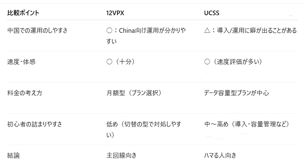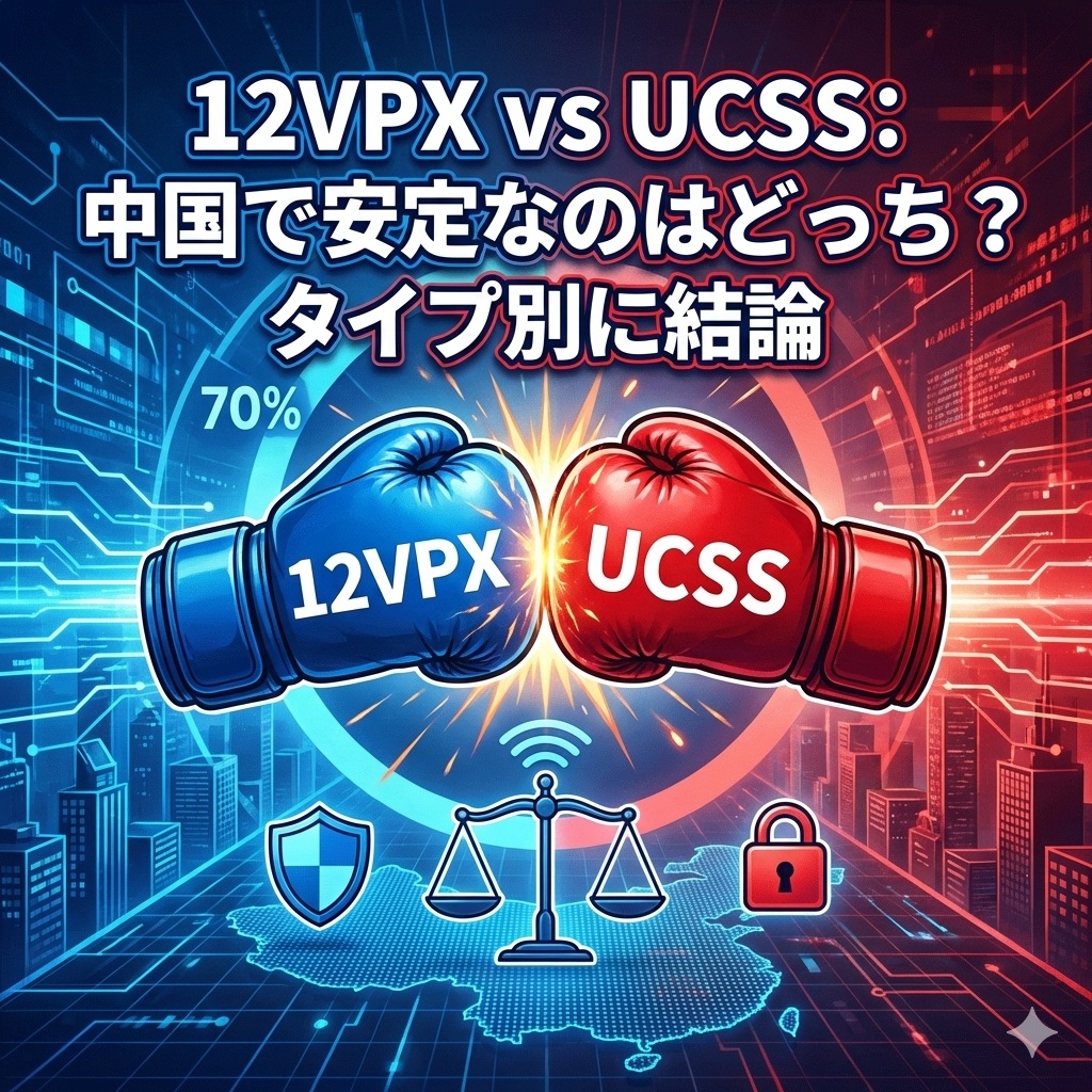 中国でVPNを探していると、最後に「12VPXかUCSSか」の2択で止まる人が多いです。