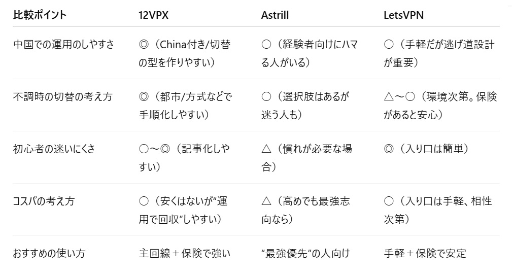 ✅ 12VPX / Astrill / LetsVPN の“違いの見方”