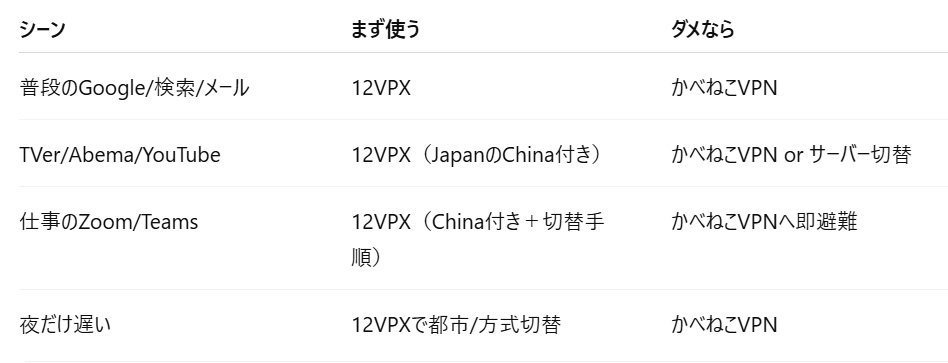 ✅ 12VPX(主回線)とかべねこVPN(保険)の役割分担