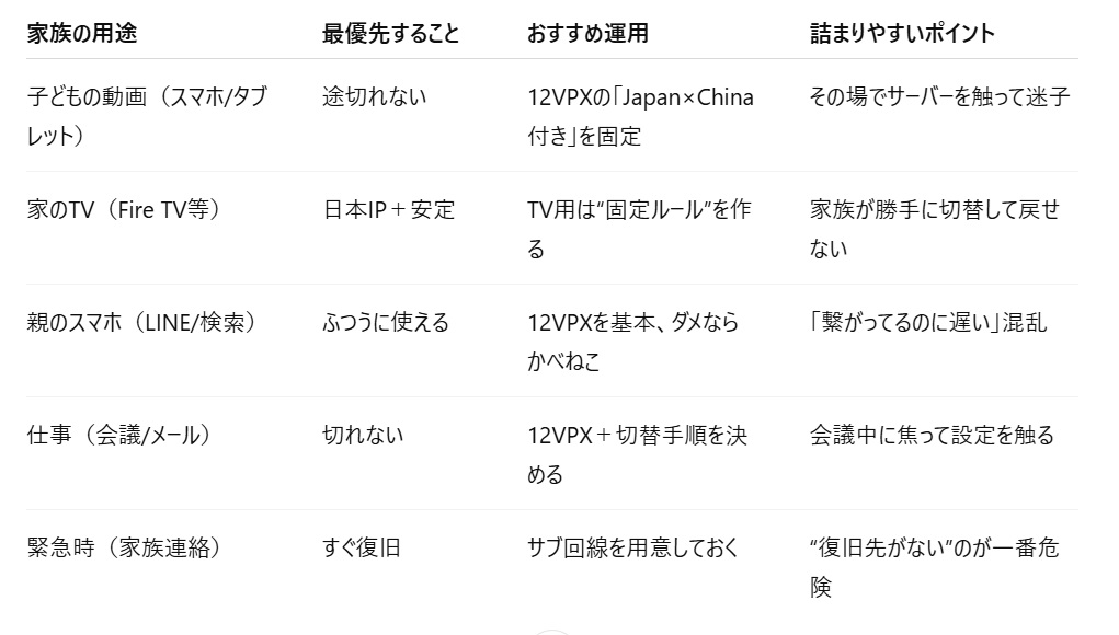 中国で家族と一緒に暮らしていると、VPNって「自分が使えればOK」じゃなくなりますよね。