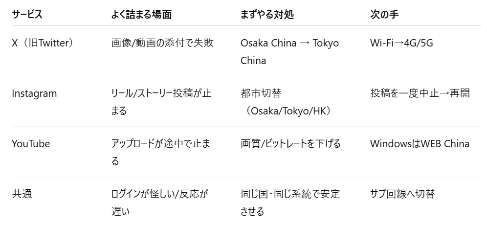 「視聴はできるのに投稿だけ失敗する」日は、都市切替で通ることがありました(盛らずに、これが現実)。